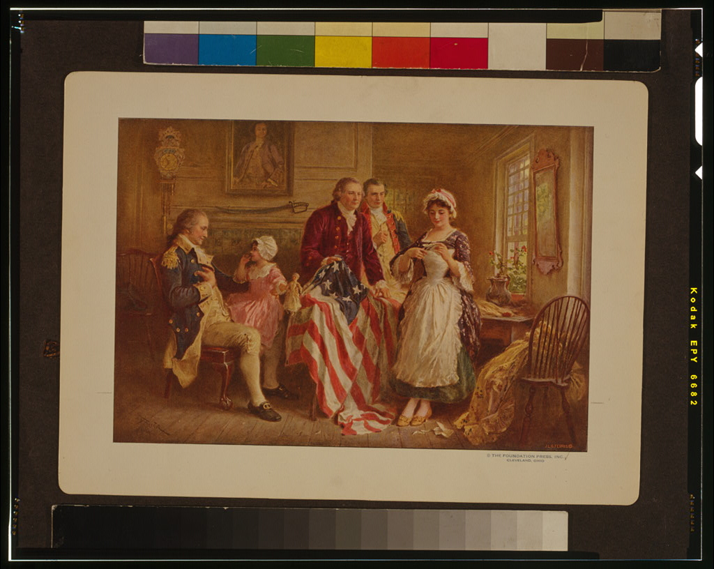 Summary: Betsy Ross showing Major Ross and Robert Morris how she cut the stars for the American flag; George Washington sits in a chair on the left. Ferris, Jean Leon Gerome, 1863-1930, artist. Created / Published: Cleveland, Ohio : The Foundation Press, Inc., c1932 July 28. Photo courtesy of The Library of Congress